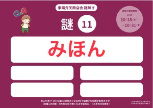 第6回 『弁天スタンプラリー&謎解き』 スタンプラリー 2025.10/15(水)〜11/15(土)の期間、スタンプラリーを開催いたします✨ 東陽弁天商店会 加盟店舗にて お会計金額1,000円ごとにスタンプ1つをゲット!異なるスタンプを3つ貯めると 「2025.11/14(金)・11/15(土)」に開催される抽選会にご参加いただけます😊 チラシは加盟店舗にございます♪ (裏面:スタンプラリー券&謎解き用紙) この機会にぜひ色んなお店を巡ってみませんか😊? 下記Googleマップでもご確認いただけます✨ https://www.google.com/maps/d/edit?mid=1wE-IpqRczc1KyutGI1obUfwkTSP2MyI&usp=sharing ※スタンプは一会計につき最大3個まで ※会計時チラシ忘れなどでスタンプラリー券が複数枚になった場合でも、異なる店舗のスタンプ3つあれば抽選可能です♪抽選会時スタッフにお伝えください。 ※お店がスタンプを重ねて押してしまったり、別の場所に押してしまった場合でも、抽選会時にスタッフが確認いたしますので、そのままで抽選会にご参加いただけます。 ※東陽歯科クリニック・筋肉貯金1号スタンプラリー対象外(スタジオ彩は11/1より対象外) ※やきにくハウスおおはしと大橋商店(コロッケなど販売)は同一店舗ですが、大橋商店でのご購入はスタンプラリー対象外 謎解き ※こちらのイベントは終了いたしました 2025.10/15(水)〜10/31(金)の期間は東陽弁天商店会、加盟店舗の店外に「謎」が現れます✨ 年齢制限なし! 解けた謎の答え+コンプリートで最大3個の駄菓子をプレゼント🎵 駄菓子交換所 10/15(水)〜10/21(火) マルサ洋品店 (定休日 木) 10/22(水)〜10/26(日) マルサ洋品店&抹茶カフェSette(定休日 月・火) 駄菓子交換所予備日 10/27(月)・10/28(火) マルサ洋品店 10/29(水)〜10/31(金) マルサ洋品店(定休日 木)&抹茶カフェSette ※駄菓子交換所予備日はチラシ表記はありません。土日でなくなることが予想されるため、駄菓子交換はお早めに! ※駄菓子は先着1,000個 期間内でも、なくなり次第終了 ※謎は10/15(水)に順次掲示予定です。 ※24.三益商事の謎は店舗が遠いため、東陽弁天商店会アーケードの赤い自販機に掲示 ※筋肉貯金1号はリニューアル中のため謎解き対象外