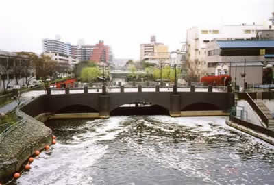 コメント:・将来を見据えて景観を重視し, 治水上の水門と連絡橋の両機能を 確保した現実的な面から水門形式 を選定した。 ・横十間川から小名木川への放流量は コントロールが可能であり, 平時流量も少ないことから, 3スパンのアーチ橋に見せかけ, 中央スパンのみを流水し,両サイド スパンはイミテーションとする 「角落とし」型式にした。 案 内:地下鉄、都営新宿線、、住吉駅 東口から南へ徒歩20分。